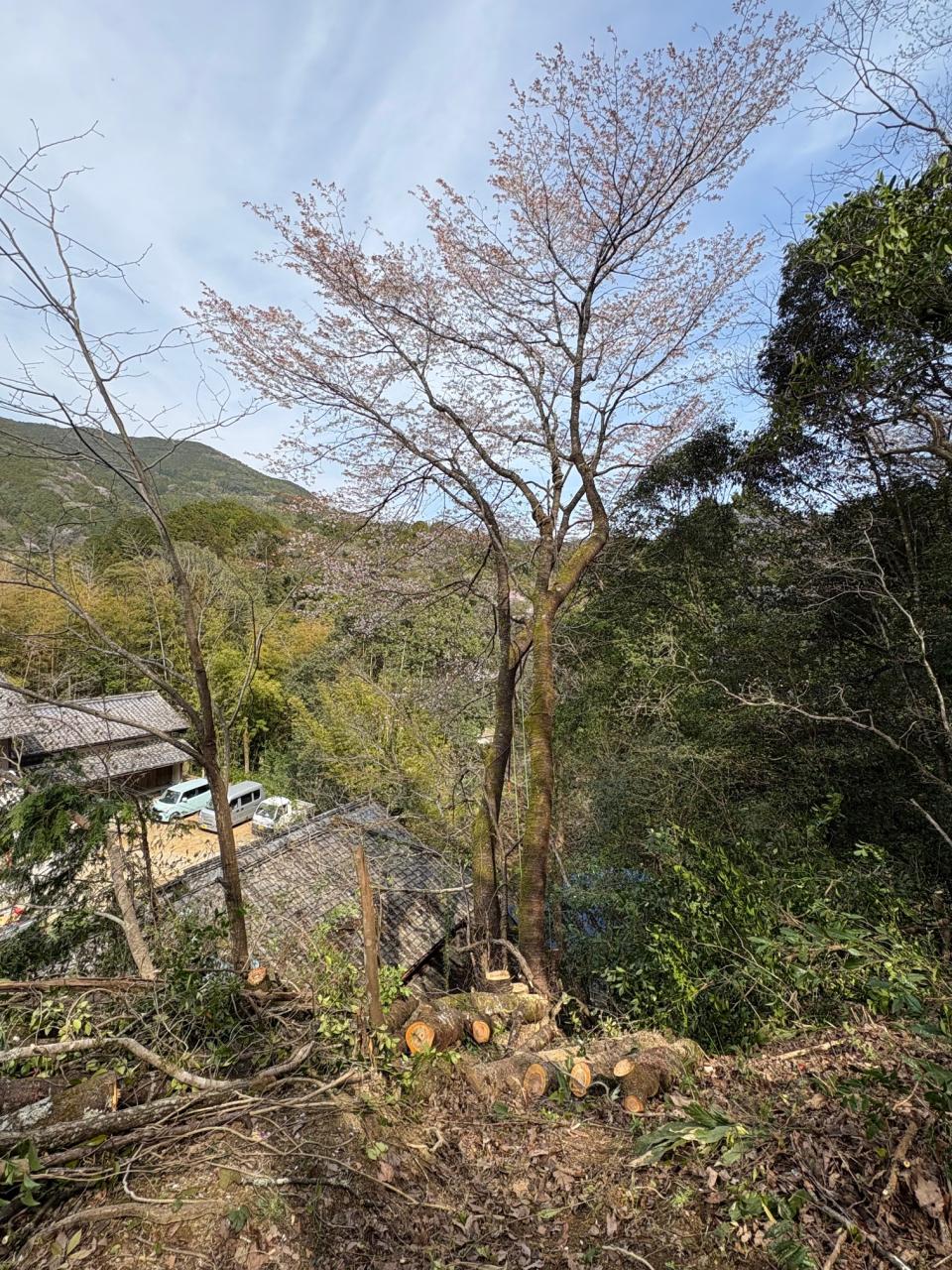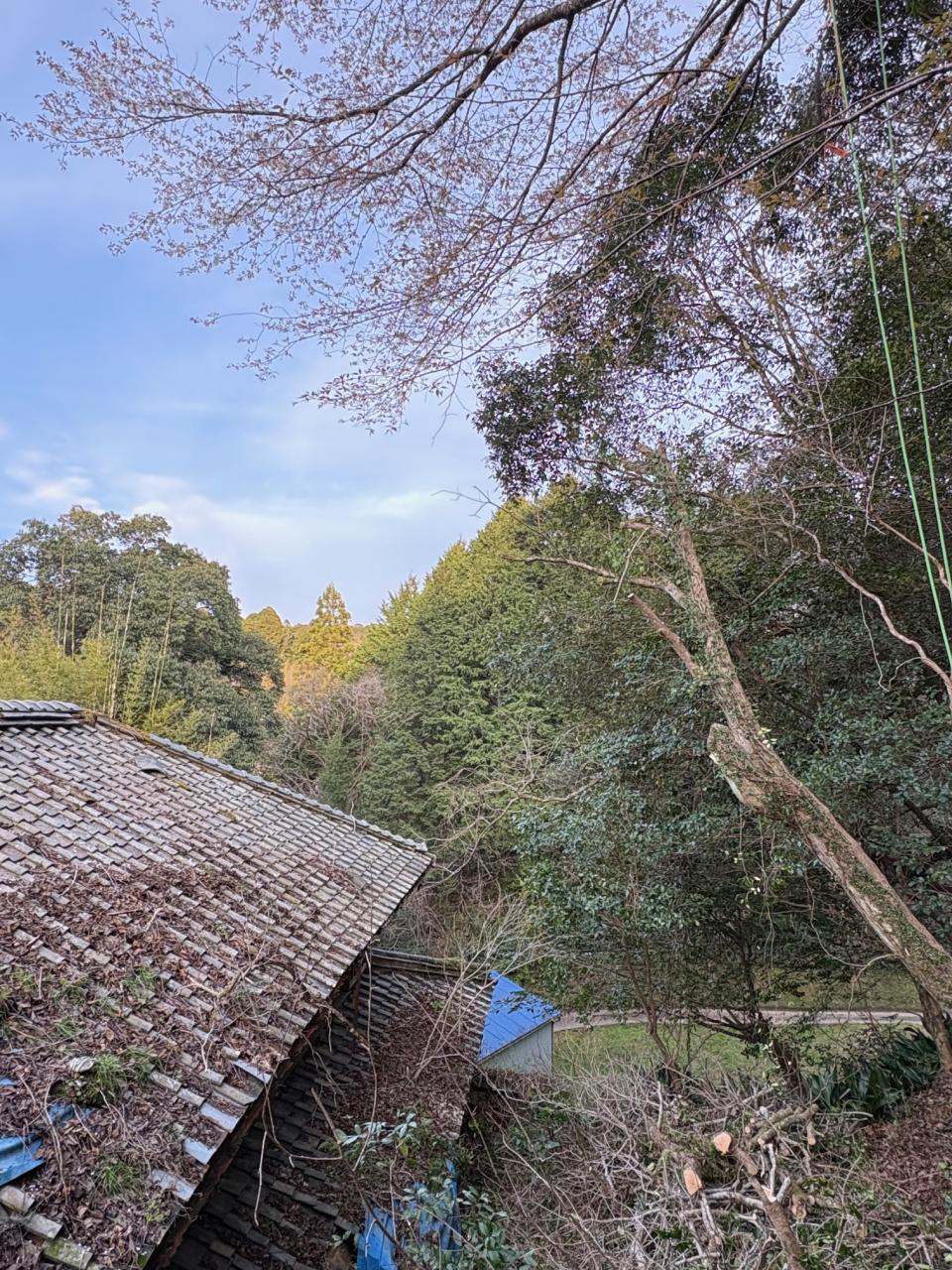 今日は高知県佐川町で特殊伐採作業を行いました。今回の作業は、建物の屋根を越えて高く成長した木の伐採と、ヤマザクラの伐採でした。高所作業となり、安全性を確保しつつ慎重に進めました。