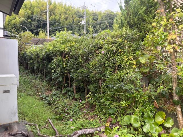 今日は、昨日伐採作業を行ったお庭で、続けて剪定作業のご依頼をいただき、マキノキの生垣の剪定を行いました。庭木や生垣の剪定は、その植物の健康を保ち、美しい外観を維持するために非常に重要です。特に、マキノキはその葉が密生しやすいため、定期的な手入れが欠かせません。我々は、高知県全域に対応し、県外のお客様にもサービスを提供しております。庭の整備や外構、エクステリアのご相談については、ぜひお気軽にお問い合わせください。お見積りは無料で承っておりますので、多くの皆様にご利用いただければ幸いです。あなたの大切なお庭を、私たちの専門技術でより美しく保つお手伝いをいたします。どうぞ、お気軽に連絡ください。