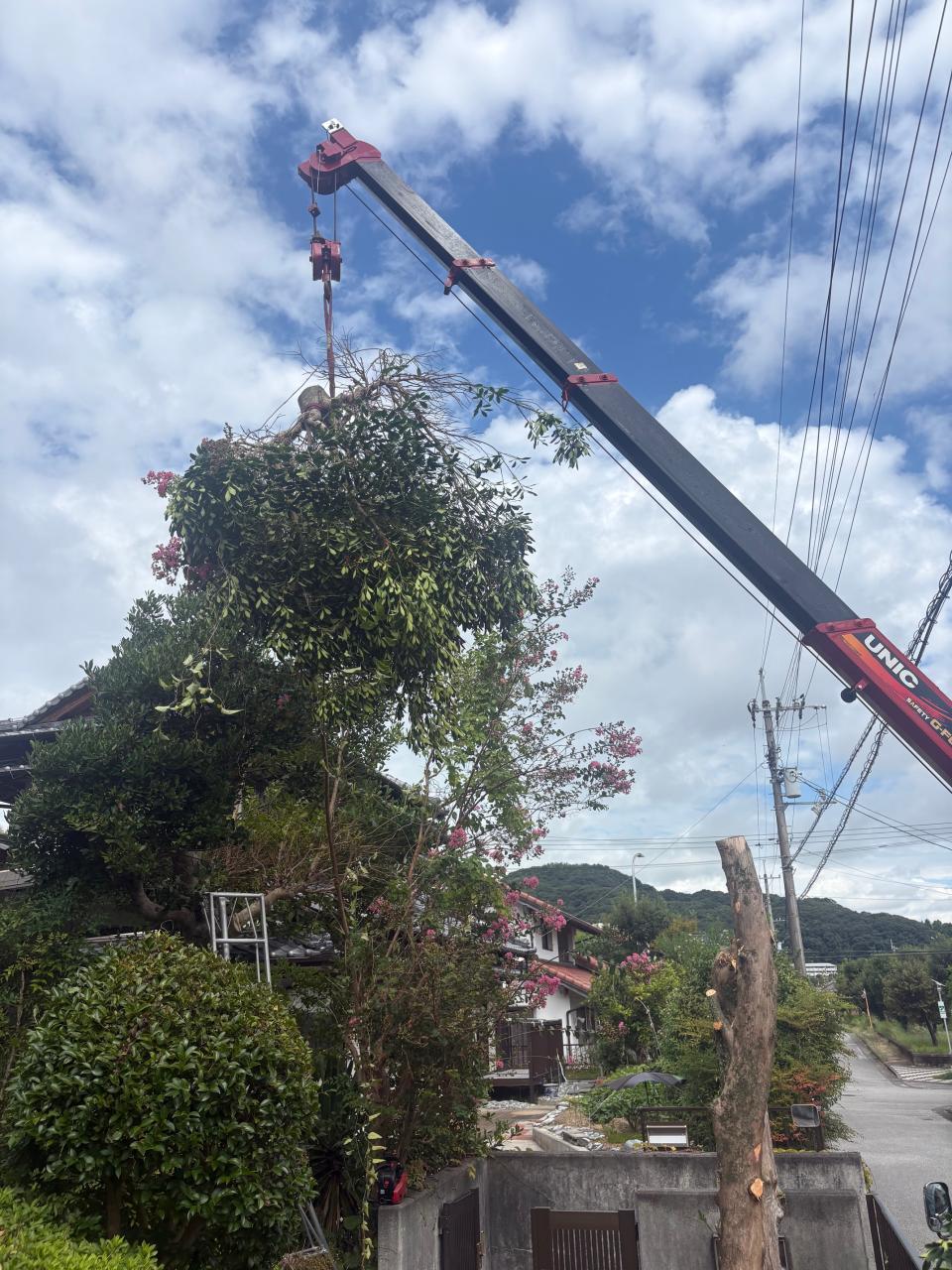 本日は、朝一番で新規のマンションにおける剪定の打ち合わせを行い、その後は南国市へ移動しての伐採作業を行いました。クレーンが大活躍し、開始が遅れたものの、一日で全ての作業を無事完了することができました。