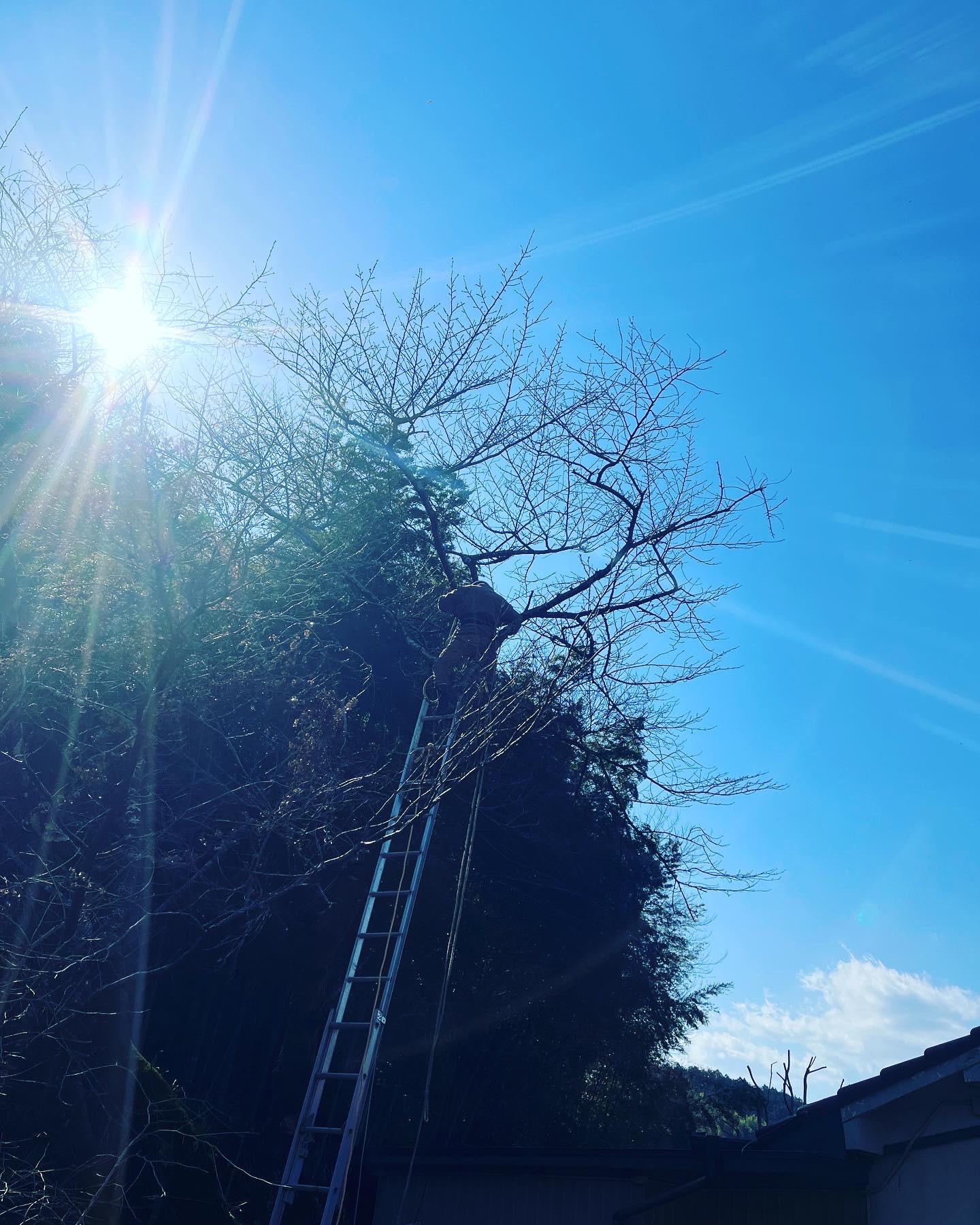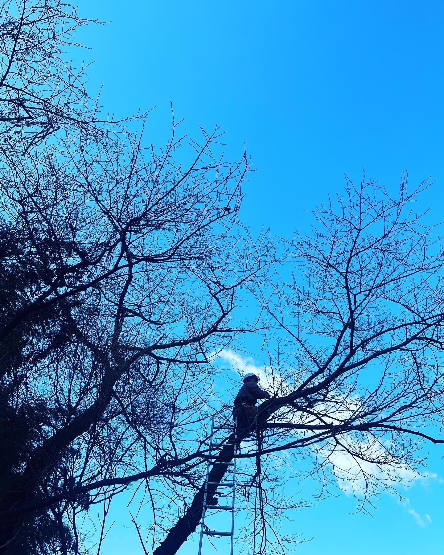 サクラノキは、大きな枝が家の上に伸びていたので脚立をかけた家に落ちないよう、先から少しづつ縮めて安全に伐採しました。