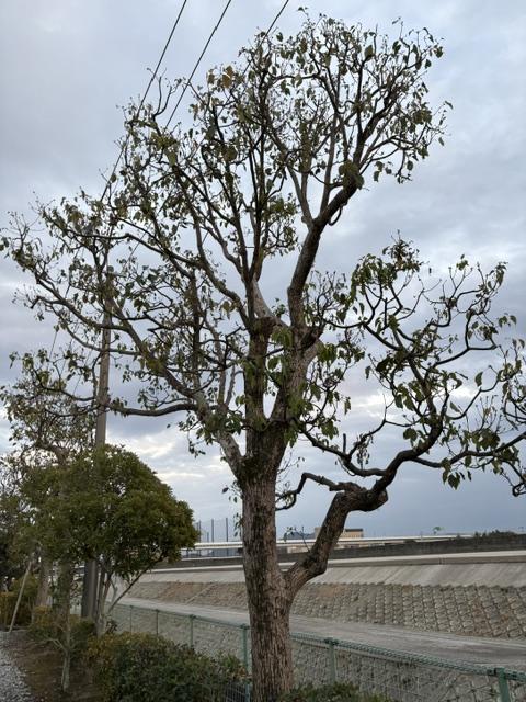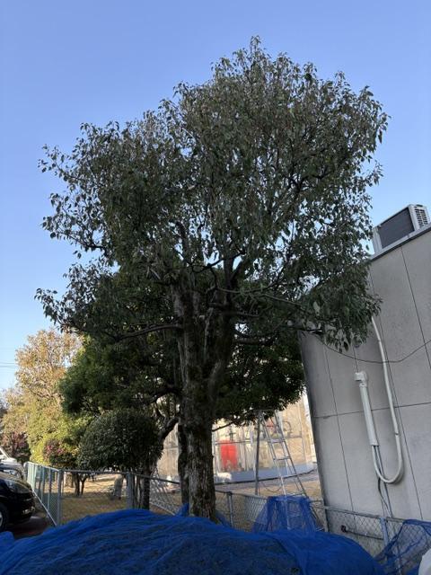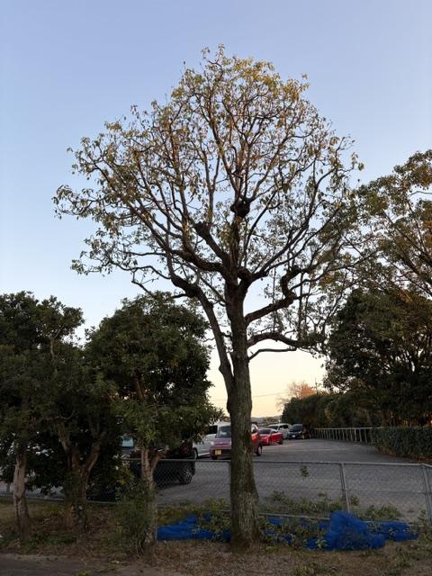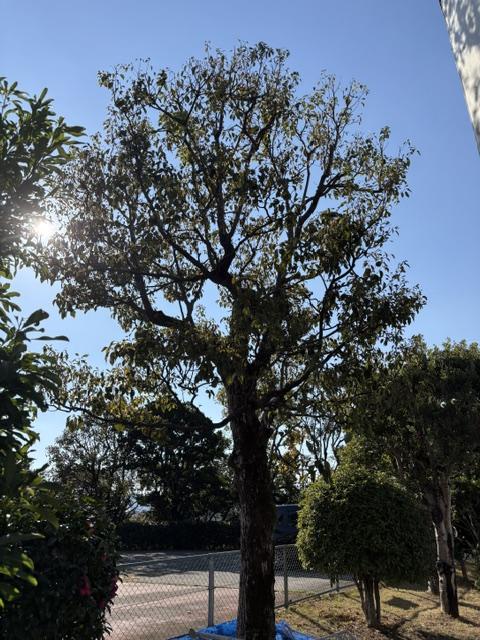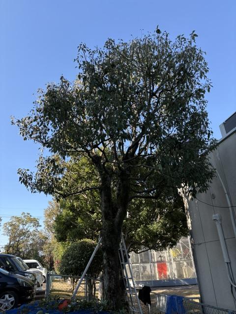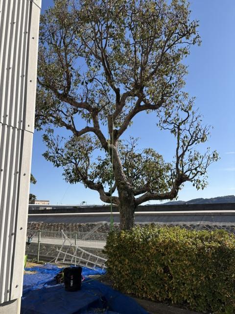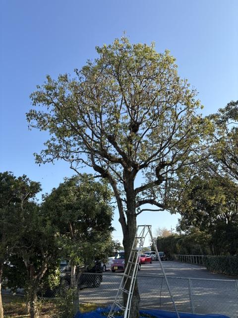 今日は高知市の技研製作所様にて、植栽の年間管理として剪定作業を行いました。今回の作業では、高木のクスノキを対象に、樹勢が少し弱まっているため、控えめに透かし剪定を実施いたしました。透かし剪定は、木の健康を保ちながら、形を整えるための重要なプロセスであり、その後の成長を促す効果があります。